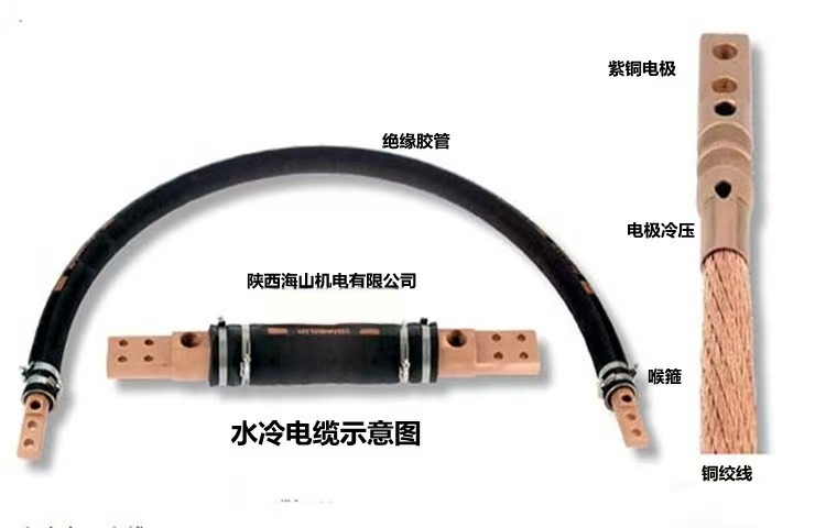 5、中頻爐專用水冷電纜紫銅電極是采用的整體銅棒車、銑加工成的,表面還做了鈍化或鍍錫處理。而導線使用的是鍍錫銅絞線,或者是漆包線,經數控繞線機編織而成,彎曲半徑小,柔軟度高。外護套管則是有加強夾布層的合成橡膠管,耐壓高。海山電爐的套管和電極之間是使用的紫銅卡箍,經專業設備冷擠壓緊固好的,密封性較好,也不易漏水。所以使用水冷電纜更加安全放心。